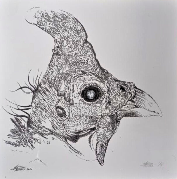 The skull rises from the page like an oracle from dust—its beak a silent echo of calls once sung across grasslands. Rendered in obsessive stipple and line, every curve speaks of grace stripped bare, yet never diminished. Feather remnants cling like memory, soft against the stark architecture of bone. This is not loss, but translation: life distilled into form, into reverence. In its hollow sockets, you sense the flutter of wings long stilled, the wind through acacia branches. The artist doesn’t mourn the creature—they immortalise its essence. A haunting, meditative print that turns mortality into melody, bone into beauty.