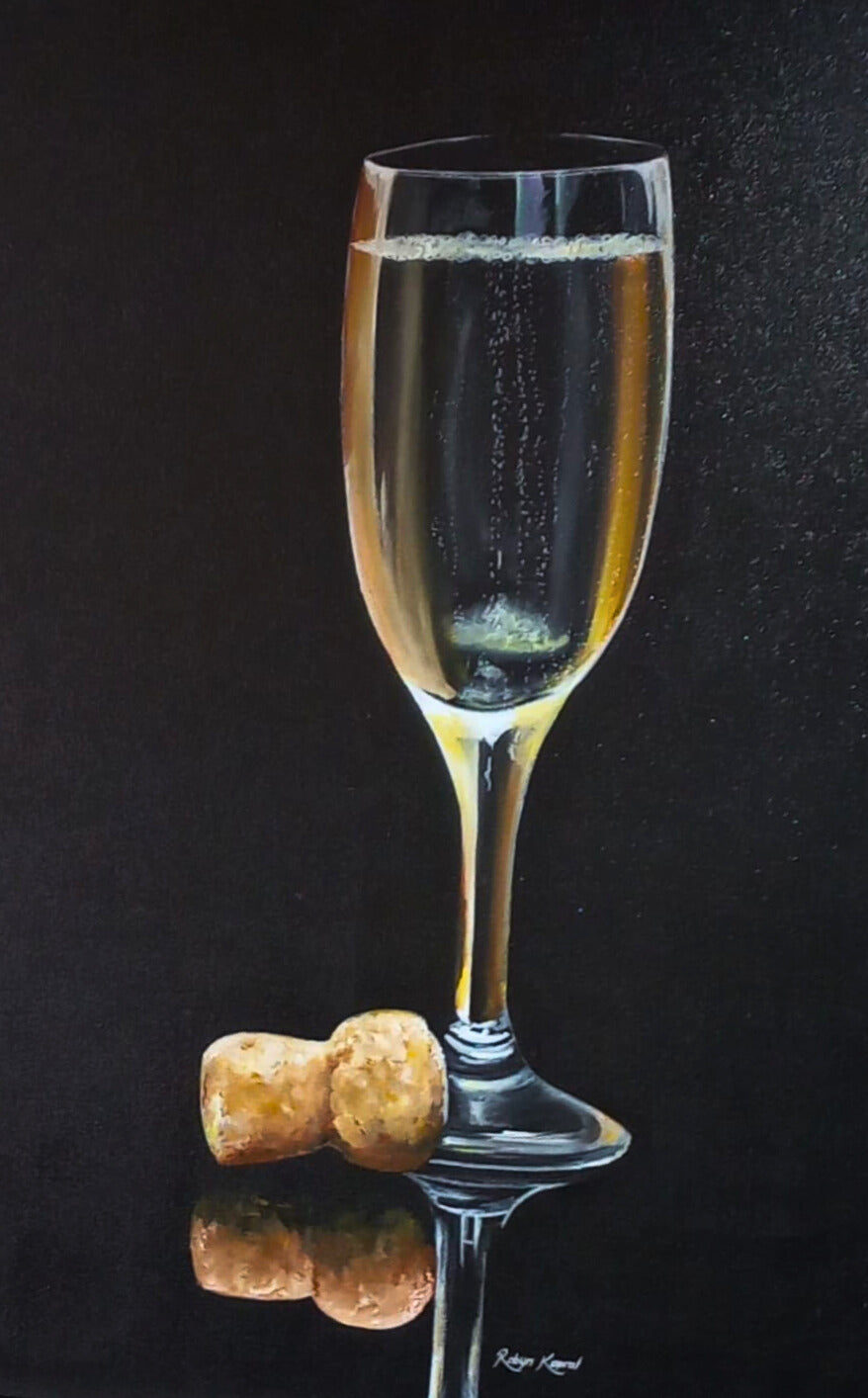 Bathed in gentle light, Celebration in Silence captures the quiet poetry of a single glass of champagne resting beside its cork — the moment after joy, where reflection lingers in the stillness. The deep black backdrop accentuates the crystal clarity of the glass, while the golden hues shimmer like liquid sunlight, embodying both refinement and restraint. This elegant still life evokes a sense of calm celebration — a toast not to the noise of festivity, but to its lingering echo. The simplicity of the composition invites contemplation, making it an exquisite addition to refined interiors that appreciate minimalism, contrast, and timeless sophistication.