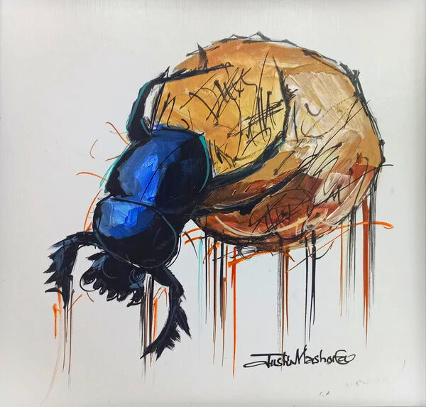 Earth Mover transforms the humble dung beetle into a symbol of renewal and perseverance. Painted in rich browns and cobalt tones, it radiates earthy elegance. The composition balances realism and abstraction, mirroring the beetle’s dual nature — grounded yet tireless. Its rounded form suggests the endless cycle of life and rebirth. Textured layers bring a sense of motion and toil to the canvas. The dripping paint creates the feeling of movement through soil and time. This artwork honours unsung heroes of nature and their role in life’s rhythm. A reminder of transformation found in the smallest acts. Perfect for those who value meaning beneath beauty.