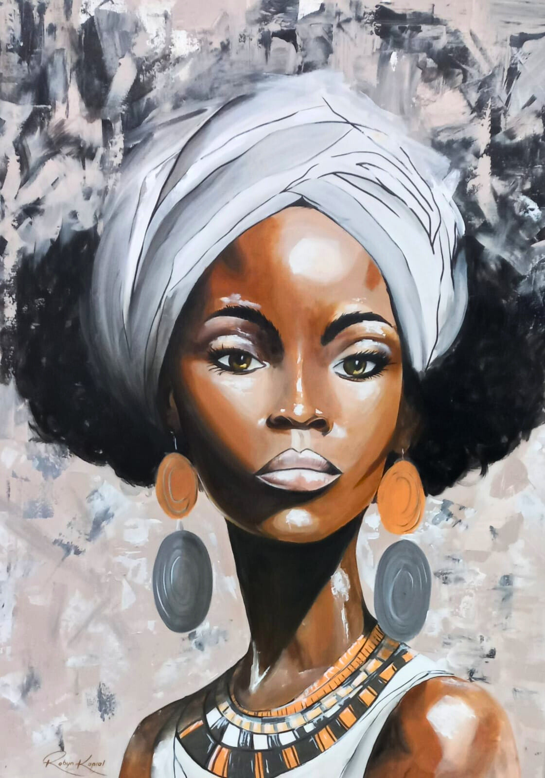 A portrait of profound grace and quiet strength, this original artwork captures a woman whose gaze holds the wisdom of ages. Adorned with a pristine white turban that frames her face like a crown, she wears bold, circular earrings and a striking geometric necklace that speaks of heritage and timeless style. Her skin glows with warmth against a dramatic, abstract background of swirling greys and whites, which serves to highlight her serene, confident expression. This is more than a portrait; it’s a celebration of Black beauty, dignity, and cultural pride, rendered with a masterful blend of realism and expressive artistry.