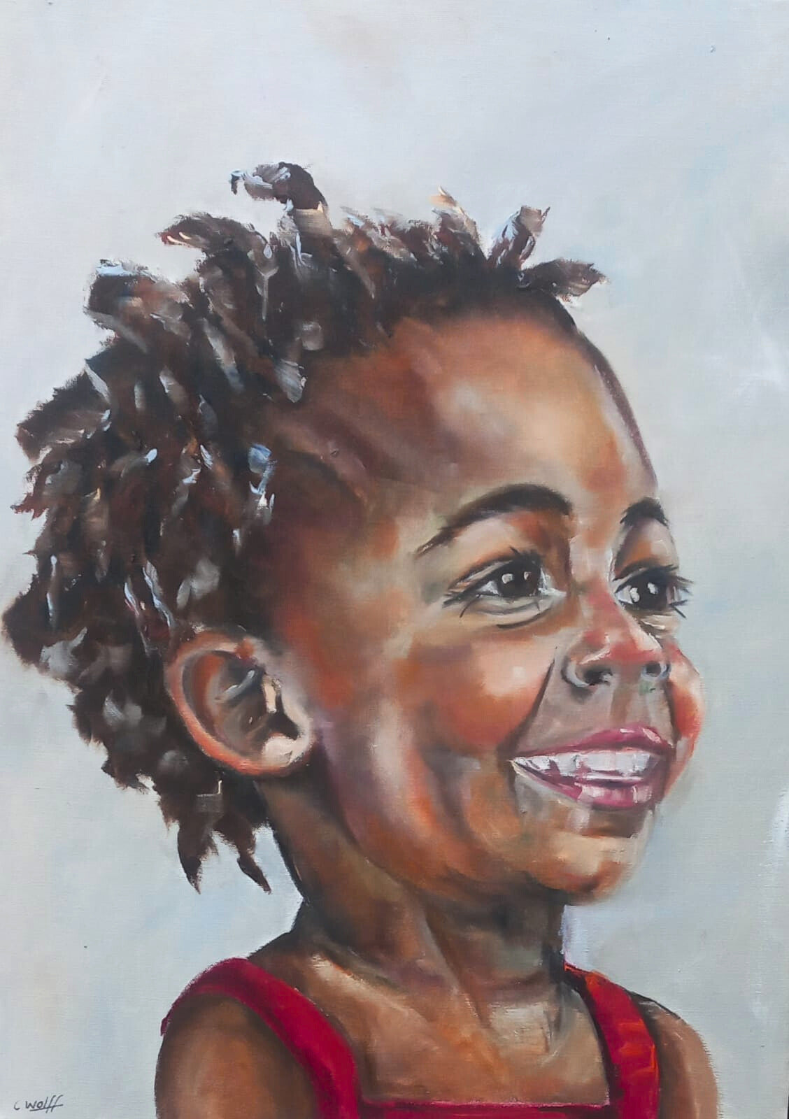 Joy in Her Eyes is a radiant celebration of innocence, wonder, and unguarded laughter. Capturing the spirit of childhood through expressive brushwork and warm, sunlit tones that seem to dance across the canvas. Her bright smile radiates pure happiness — an unfiltered moment of delight that feels both nostalgic and timeless. The careful attention to detail — the subtle shimmer of light on her skin, the spark in her eyes — evokes a sense of connection that reaches beyond the portrait itself. This artwork fills any room with warmth and energy, inviting the viewer to rediscover the simple beauty of being alive. Joy in Her Eyes is more than a portrait; it’s a visual hymn to hope, light, and the enduring brightness of youth.