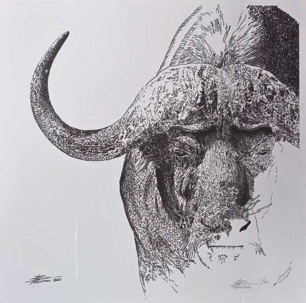 A single horn curves like a crescent moon, framing a face carved from earth and shadow by a thousand patient strokes. This is not just an animal—it is a monument to wild resilience, its eyes holding the weight of the savanna and the memory of ancient migrations. The artist’s pen renders every wrinkle, every coarse hair, turning ink into living texture, into raw, untamed power. There’s no roar here, only silence—a deep, knowing stillness that speaks louder than any sound. You feel the heat of the sun on its hide, the dust of the plains clinging to its brow. It’s a portrait of dignity, of a creature who needs no crown to command reverence. A collector’s piece that humbles the viewer with its quiet, monumental presence.
