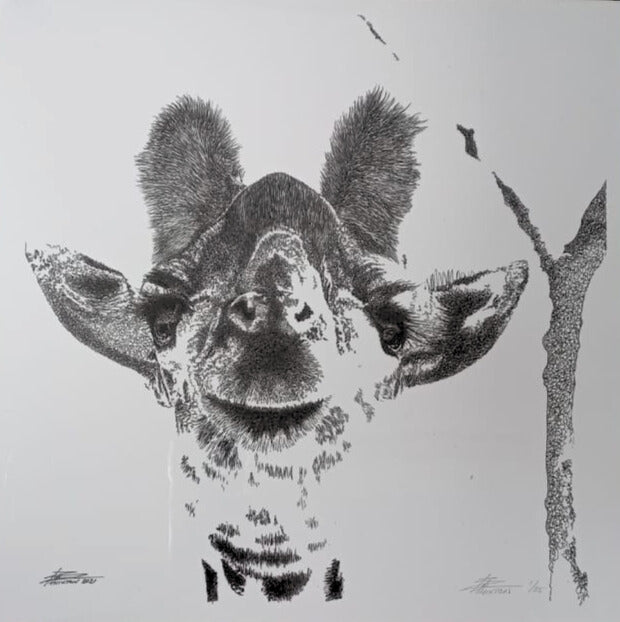 Up close, the giraffe’s face unfolds like a poem written in hide and eyelash—long-lashed eyes holding galaxies of calm. The artist’s pen traces every wrinkle, every strand of coarse hair, transforming ink into living warmth. A single acacia branch grazes the edge, rooting this gentle giant in its sun-baked world. There’s majesty here, yes—but also vulnerability, a quiet trust offered in the tilt of its brow. This is not a monument from afar, but an intimate encounter: one soul meeting another across the page. A portrait that doesn’t demand awe, but invites tenderness. For those who know that the tallest hearts often speak the softest.